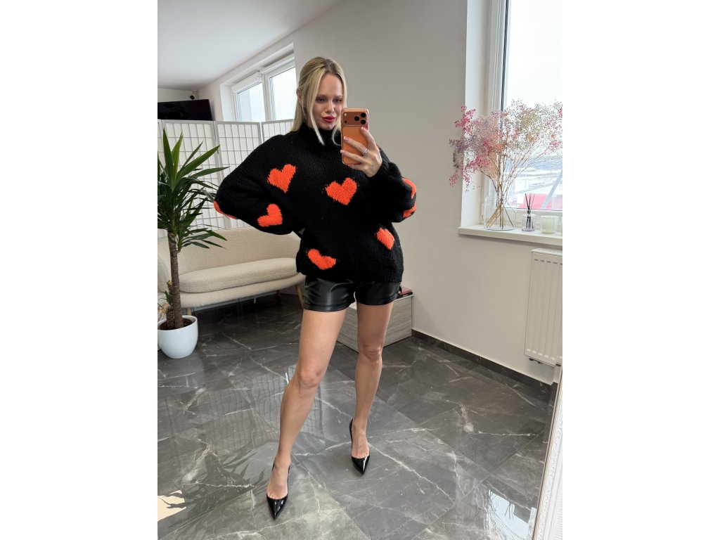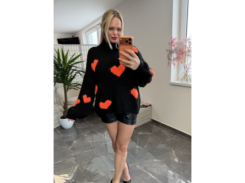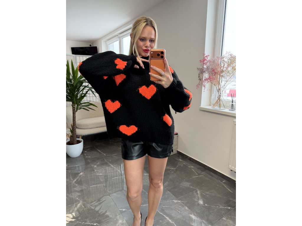 Oversized svetrík s romantickým motívom zaujme na prvý pohľad. Kombinácia čiernej a oranžovej je neprehliadnuteľná. Veľkosť uni sedí xs s m l xl.
